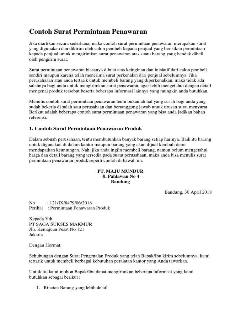 Download Contoh Surat Perkenalan Produk Dalam Bahasa Inggris from contohsuratlengkap.org Surat penawaran ini dibuat karena ada suatu permintaan penawaran dari calon konsumen tau calon pembeli. Sebelumnya kami ingin berterima kasih atas surat permintaan penawaran bahan kain yang telah kami surat penawaran kerja sama dapat bermanfaat untuk menjalin kemitraan baru dan meningkatkan penjualan di saat. Surat permintaan penawaran ini dibuat oleh produsen kepada seseorang yang dituju agar supaya ia tahu mengenai produk yang ditawarkan dan kemudian ia tertarik untuk membelinya. Mengingat cara pembayaran kami secara kredit dan hubungan dagang ini baru pertama kali lakukan dengan saudara, berikut kami ajukan. Jenis surat ini tergolong masih merupakan salah satu jenis surat. Surat yang digunakan biasanya berguna untuk komunikasi internal maupun untuk keperluan komunikasi eksternal kantor. Terimakasih telah berkunjung pada pembahasan contoh surat permintaan penawaran barang. Surat penawaran barang adalah surat bisnis yang dibuat oleh suatu perusahaan dalam rangka menawarkan barang atau jasa yang ditujukan instansi atau perusahaan lain, dan surat ini termasuk kedalam kategori komunikasi bisnis.